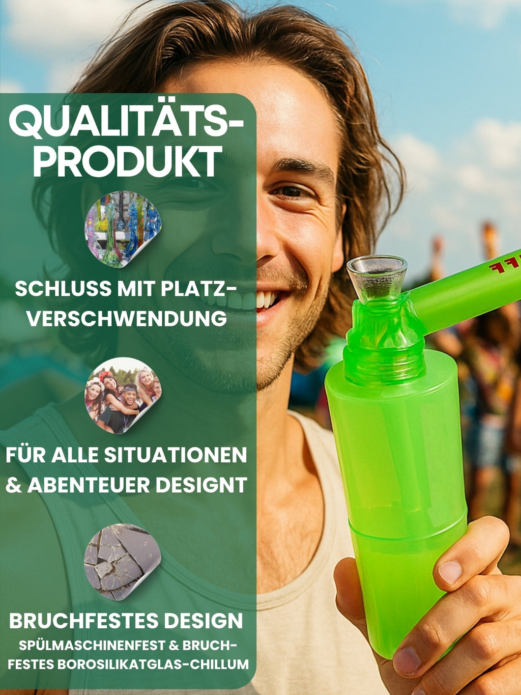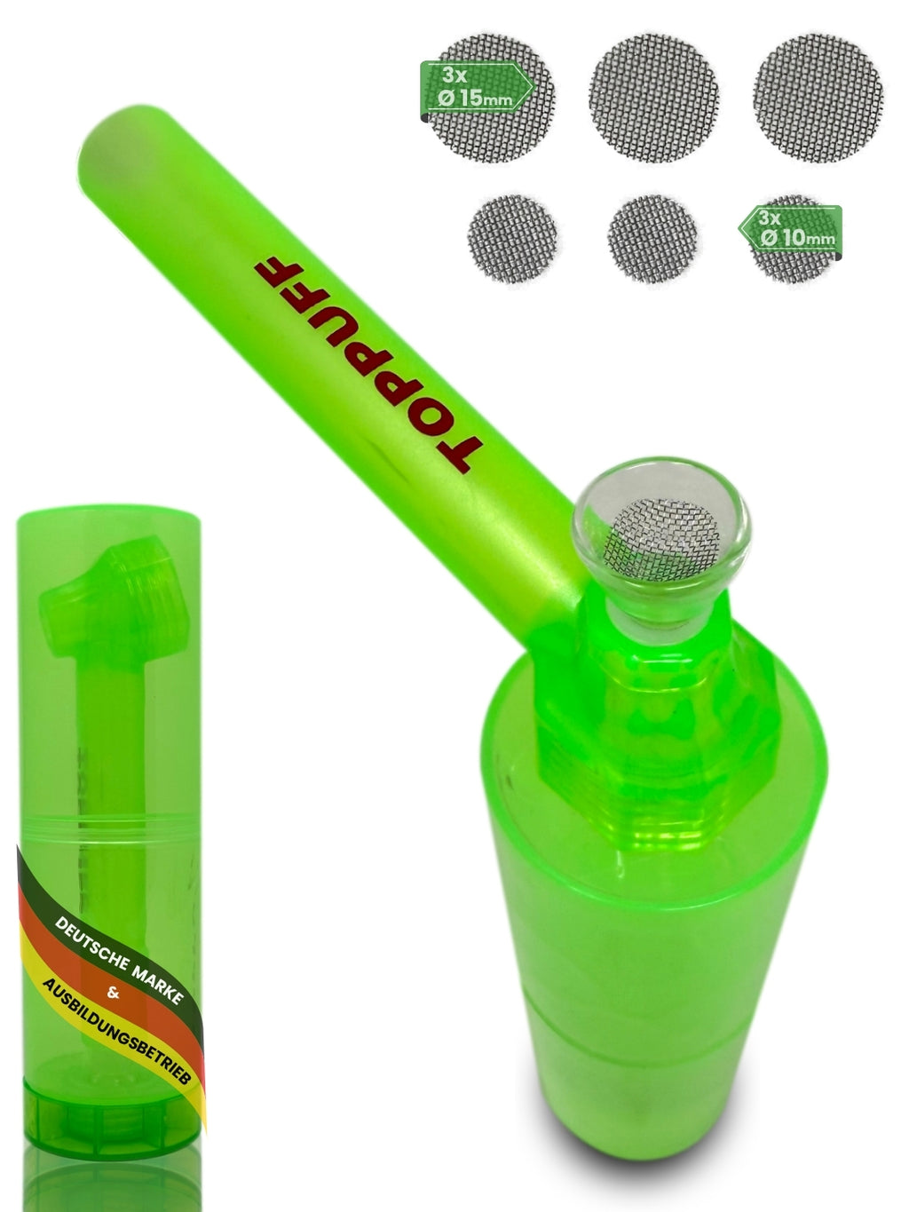 - ✨ AUFGEBAUT IN SEKUNDEN + ANLEITUNG - 1. Körper aufschrauben & Teile ausgebreitet hinlegen. - 2. Untere Bowl mit Wasser füllen & Acryl-Filter einsetzen. - 3. Oberen Rauchkörper aufstecken & Mundstück aufschrauben. - 4. Glas-Chillum mit Gefühl oben einstecken. - 5. Im Set enthaltende Siebe in Kopf legen und Gut rein! - 6. Genießen!