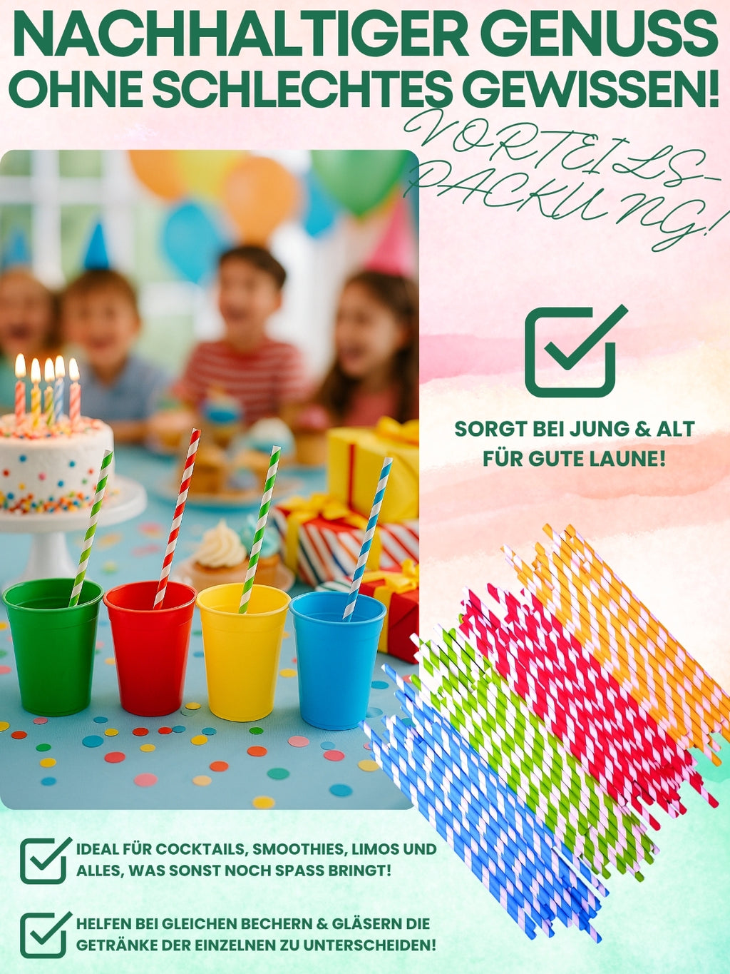 - 🌈 FARBENFROHE PAPIER STROHHALME FÜR JEDE GELEGENHEIT - Die bunten Papierstrohhalme von EKNA zaubern sofort gute Laune auf jede Feier! - Mit leuchtenden Streifen in Blau, Rot, Gelb und Grün werden Getränke zu fröhlichen Eyecatchern für Groß und Klein!