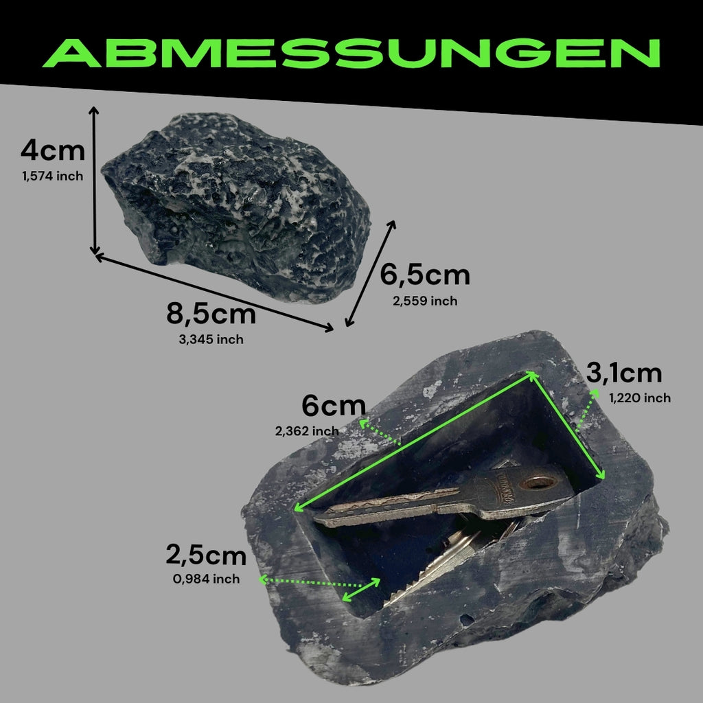 • 📐 SCHLÜSSEL STEIN GRÖßE - Unser Schlüsselversteck aussen hat die Länge: 8,5cm; - Breite: 6,5cm; - Höhe: 4cm. Das Geheimfach der Stein Attrappe ist 6cm lang; 3,1cm breit mit einer Tiefe von 2,5cm! Jetzt kaufen und nie wieder einen Schlüssel-Dienst rufen oder warten bis jemand nach Hause kommt!